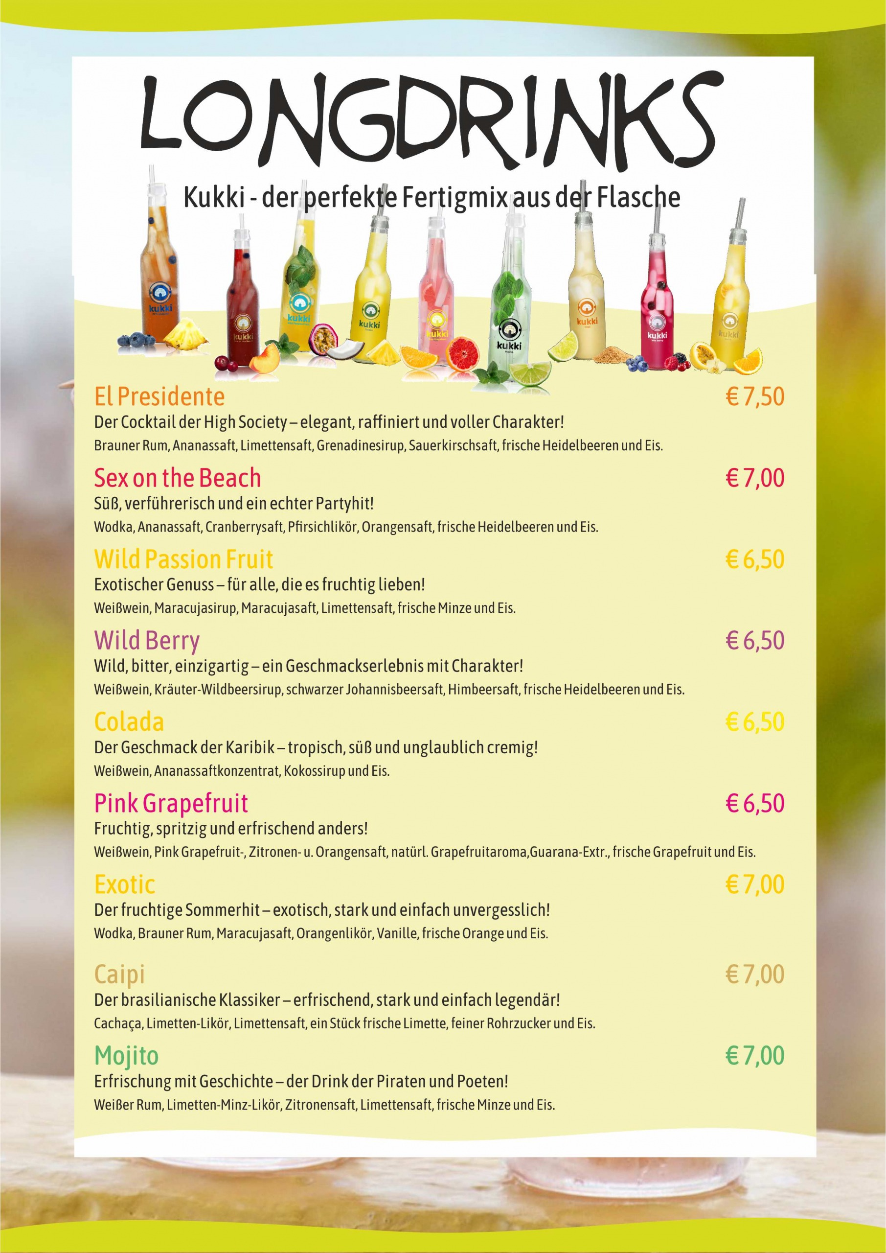 Neben unserem Getränkeangebot haben wir eine vielseitige Cocktailkarte, die bestimmt auch Ihren Lieblingscocktail bereithält. Auch unter der Woche.