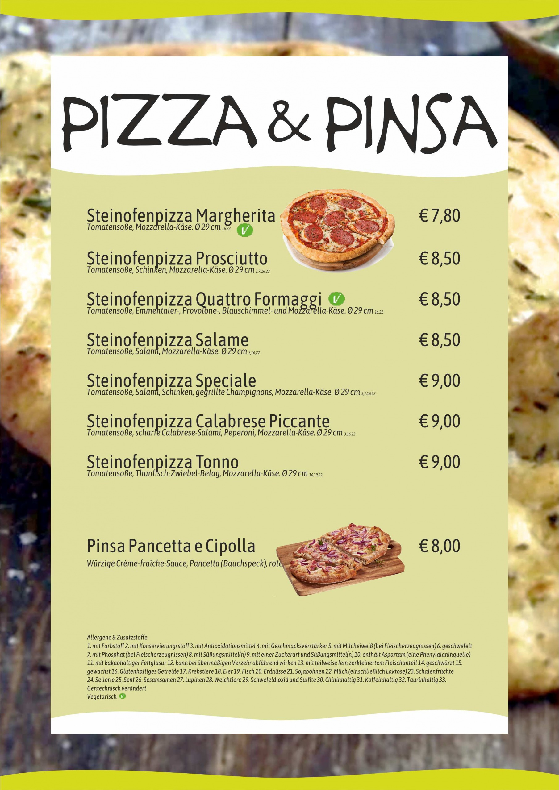 Dann gibt es in unserem Gastro-Bereich original Steinofenpizzen und Pinsen in zahlreichen Varianten – alles frisch gebacken in unserem speziellen Steinofen.